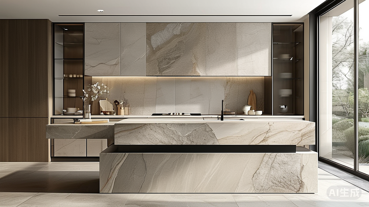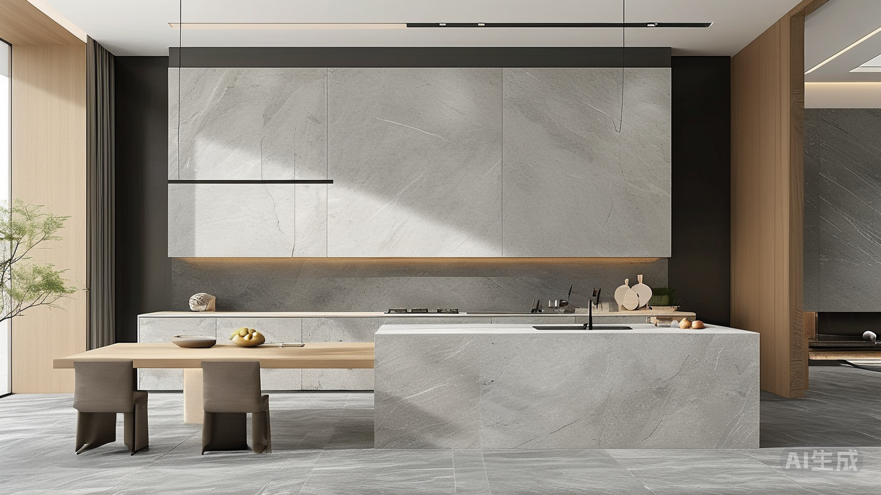打破传统:岩板如何通过极简设计,实现空间的一体化?曾几何时,瓷砖的网格与大理石的繁复雕琢,如同空间的标点符号,不断提醒着我们建筑的拼凑本质。然而,当整片岩板以磅礴之姿铺陈开来,空间的叙事骤然改写——极简不再是空洞的减法,而是用最纯粹的物质语言,编织一场没有边界的视觉流动。 岩板,便是这场空间革命的沉默画师。它告别传统建材的零碎拼贴,以动辄数米的尺度在空间延展。无论是铺就地面、攀援墙面,抑或化身一体式岛台,它以整片覆盖的魄力,抹除了切割空间的视觉碎片。物理的接缝被消隐,目光得以无碍滑行,空间的边界感随之溶解,小户型因此舒展,大宅邸更显磅礴。
