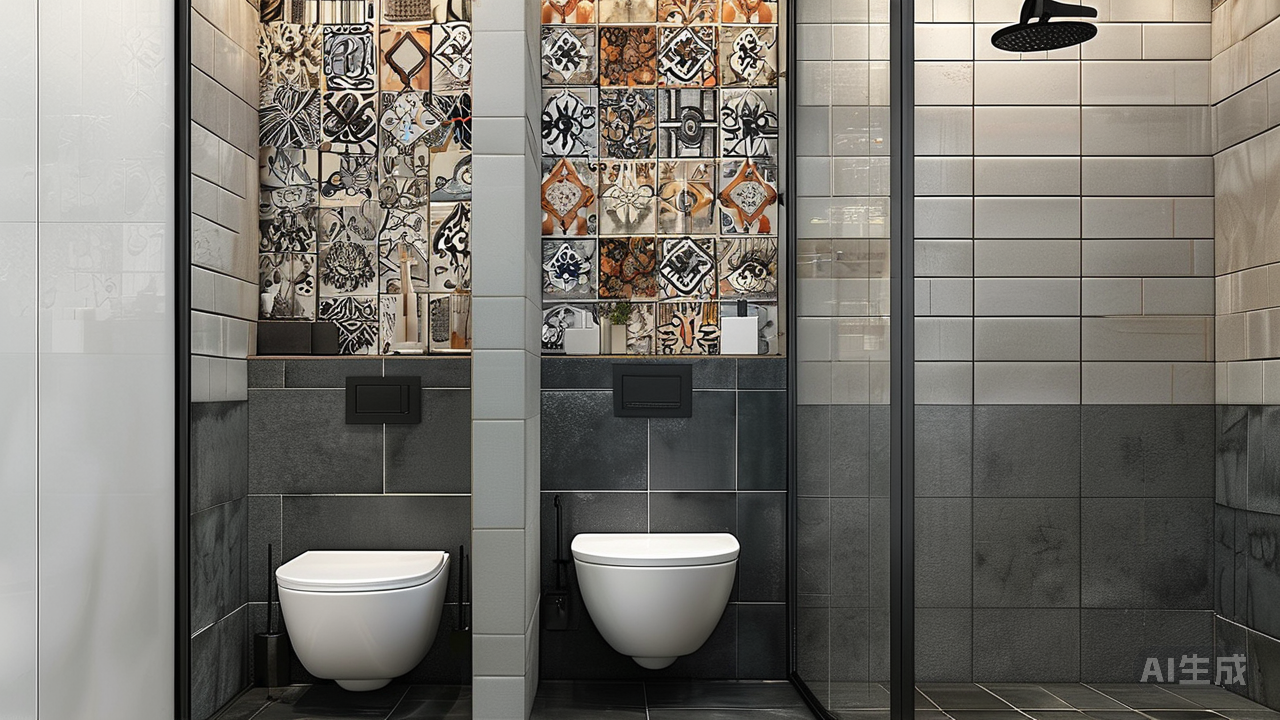 上下分色法:卫生间墙面可采用上下分色,下半墙用深色或花纹砖防脏,上半墙用浅色砖提亮空间,并可用腰线过渡。