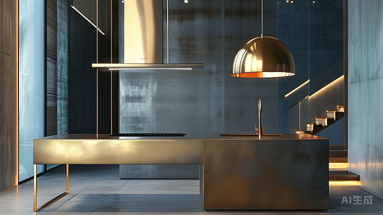 金属:骨架的精致化叙事 金属是工业风的骨骼,它定义了空间的硬朗基调。但进阶玩法在于超越冰冷的管道功能,将其升华为精致的视觉语言。 摒弃粗糙的黑铁方管,尝试更具细节感的材质。黄铜的温润光泽、紫铜的氧化质感,或是经过拉丝处理的不锈钢,都能在保留金属本质的同时,注入一丝奢华与温度。它们可以是厨房中岛的纤细支脚,是楼梯扶手的优雅曲线,或是一盏定制金属吊灯的结构主体。这些金属构件不再是背景,而是空间中的雕塑品,其光影变化成为每日的艺术。