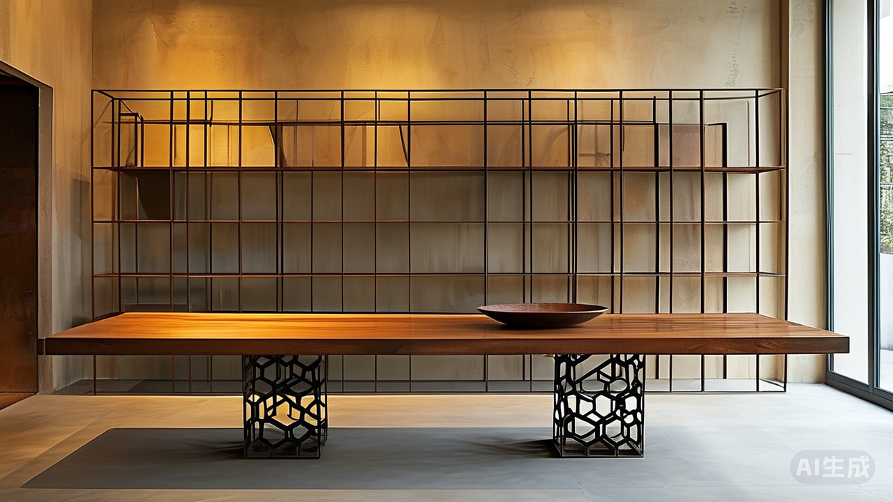 更巧妙的做法,是将金属用于家具与收纳。一个厚重的实木长桌,搭配铸铁的镂空几何底座,沉稳中透出轻盈;一整面由复古铁艺框架构成的收纳系统,既是强大的功能体,也是充满岁月故事的背景墙。关键在于形态的精致化与功能的艺术化,让金属从“工业零件”变为“空间首饰”。