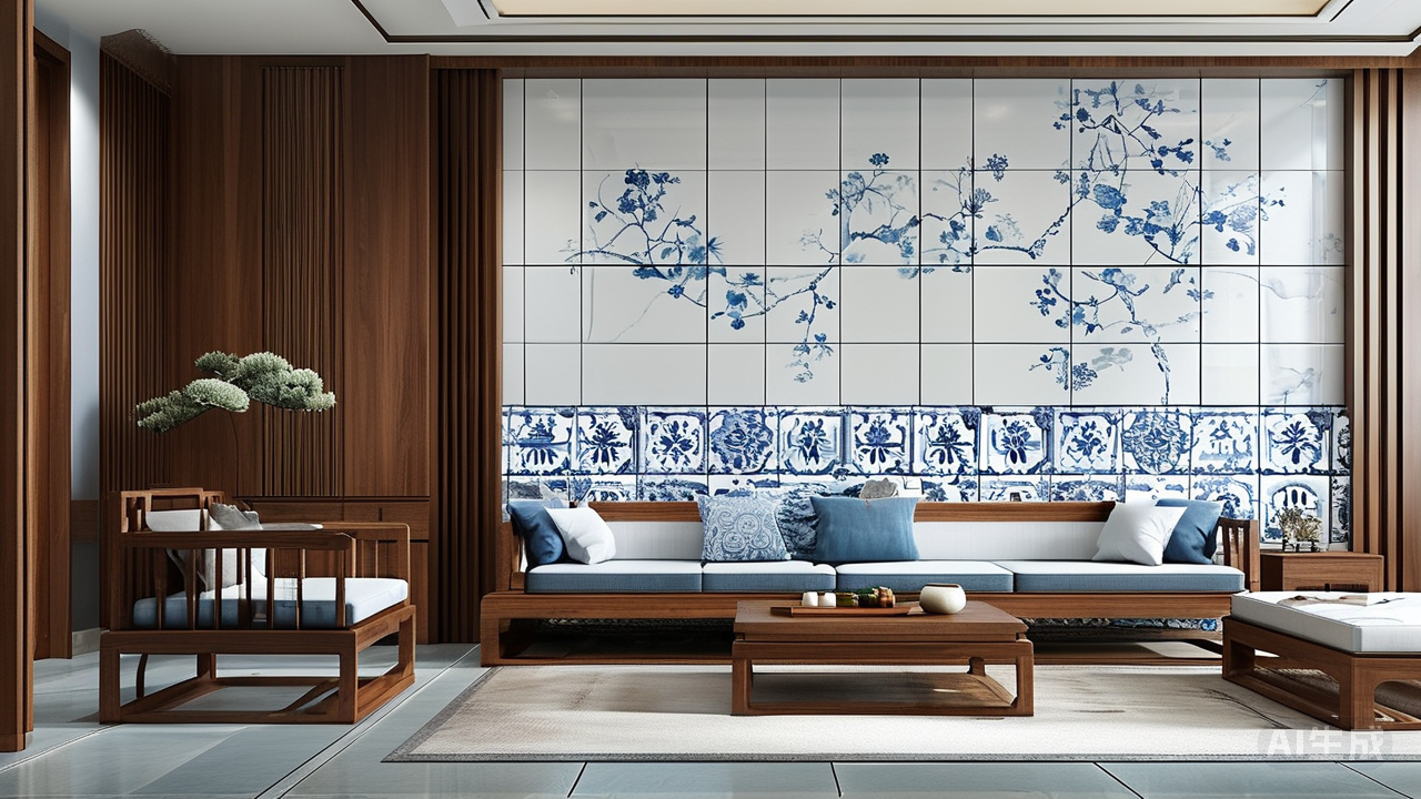 确定了基调,瓷砖的铺贴法则便是勾勒空间骨骼的笔触。新中式美学讲究“隔而不断”,这种意境亦可借由铺贴方式来体现。人字拼、工字拼等错落有致的拼法,能打破大面积地面的单调,赋予其动态的韵律感,仿佛时光的足迹在其上流动。更为巧妙的,是运用不同颜色或材质的瓷砖进行区域划分。例如,在客厅与茶室之间,以一道沉稳的深色瓷砖边框作为无声的界定,既保持了空间的通透性,又暗示了功能的转换,契合了东方美学中“藏露有度”的哲学。 当空间的皮肤与骨骼已然就位,点睛之笔在于让瓷砖与其他元素共奏和弦。瓷砖与胡桃木家具是天然的盟友,一冷一暖,一刚一柔,木质醇厚的温度恰好中和了瓷砖的清冷,共同围合出安稳沉静的场域。墙面亦可与地面呼应,采用同系列但规格较小的瓷砖,或是以带有青花瓷韵味的蓝白花纹砖作为背景,于细节处彰显文化底蕴。