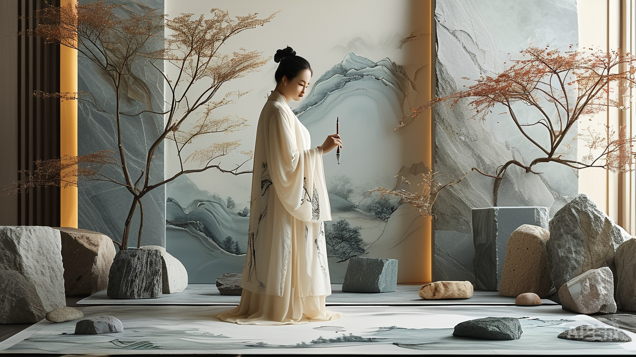 此种意境的营造,深得东方美学精髓。它不讲求对自然山水的逼真模仿,而重在“意造”,追求神韵的相通。设计师如同画家,石材与瓷砖便是他们的宣纸与墨汁。他们凭借对材料天赋纹理的敏锐洞察,略作勾勒与铺陈,便“借”自然之力,成就天成之趣。这其中有“计白当黑”的智慧,墙面地面的留白,与家具器皿的实体形成虚实相生的节奏;更有“妙在似与不似之间”的哲学,它唤醒的不是你眼中所见,而是心中所藏的那片山水记忆。