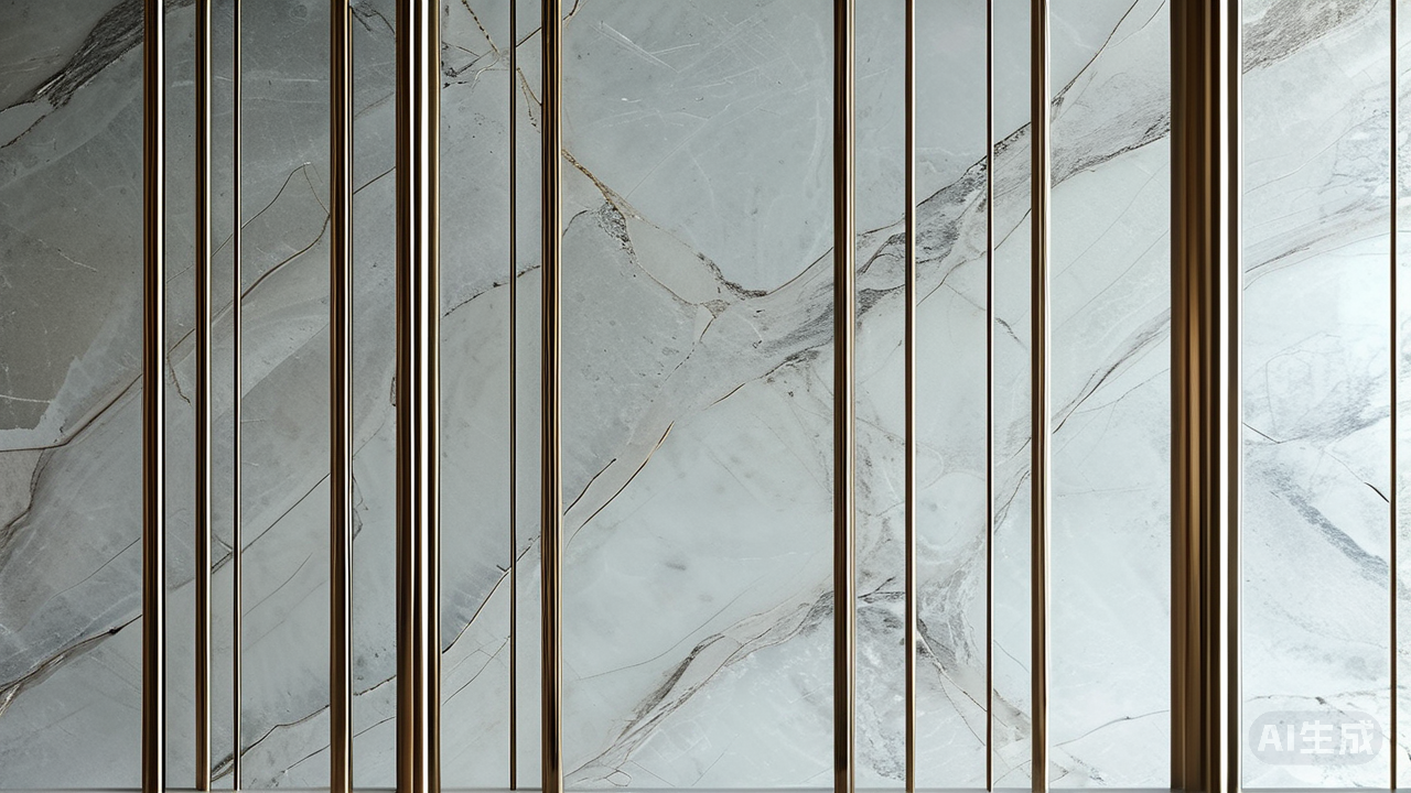 金属线条:空间中的精致笔触 如果说鱼骨拼大理石是空间的骨架与肌肤,那么金属线条便是那勾勒轮廓、点亮神采的精致笔触。法式轻奢摒弃了古典主义中可能出现的厚重金箔与繁复雕花,转而青睐更为纤细、精巧的金属元素。 这些纤细的金属线条,多以香槟金、黄铜色或哑光黑出现,它们可以出现在各个细节之处:作为踢脚线,巧妙地分隔墙面与地面,增强立体层次;作为门套、镜框的镶边,赋予几何轮廓以清晰的定义;甚至可以作为墙面分色处的嵌条,或是衣柜、橱柜上的拉手与装饰线。这些线条如同一位技艺高超的素描画家手中的铅笔,精准地强调出空间的轮廓,于无形中划分了功能区域,提升了整体的精致度。